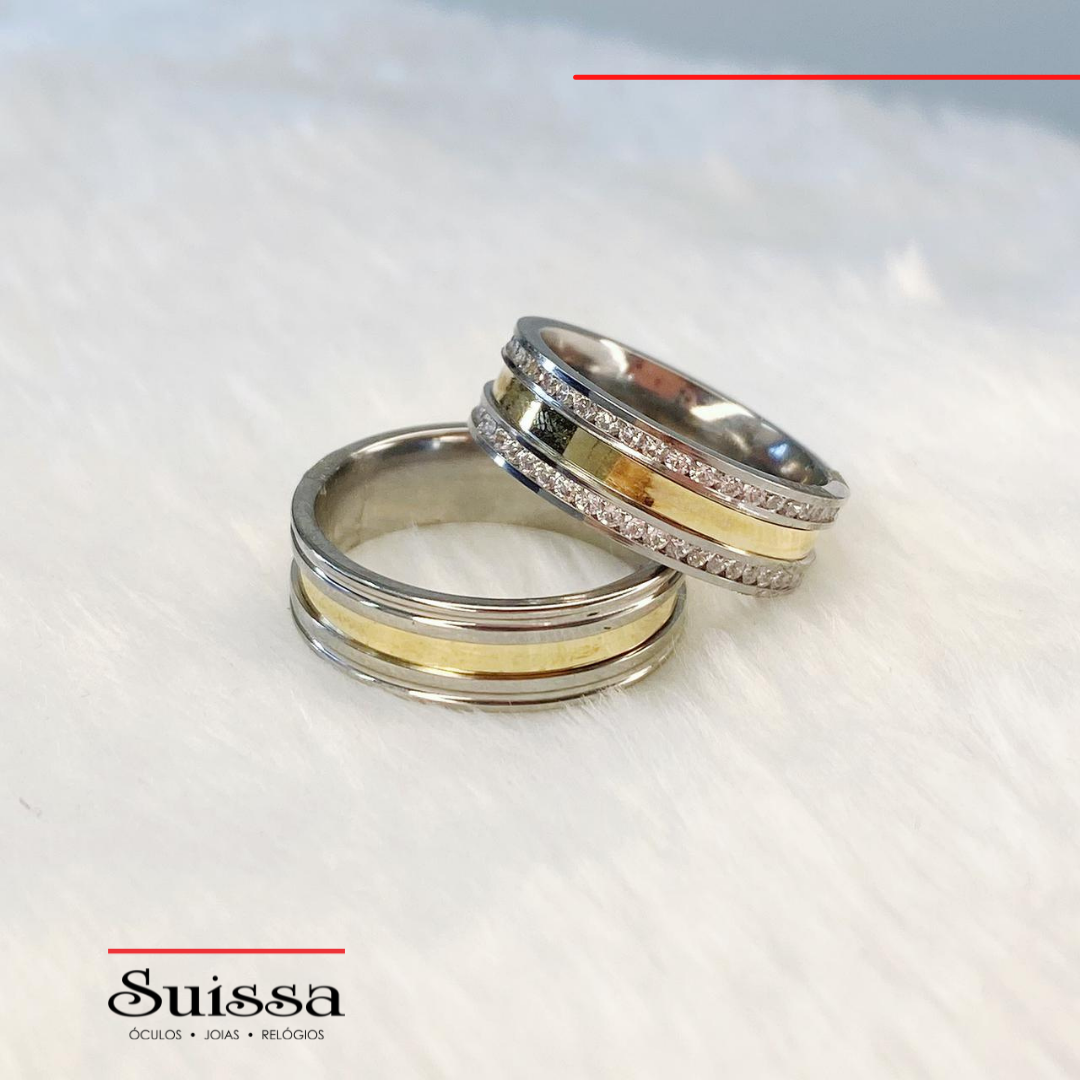 As alianças são confeccionadas em aço, mesclam acabamento polido e fosco.