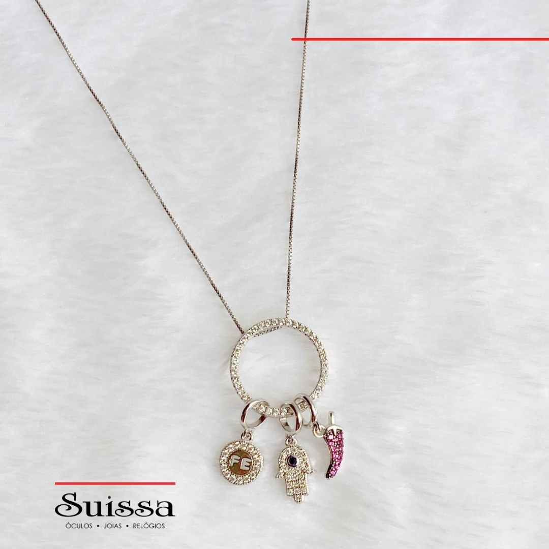 A corrente é estilo veneziana confeccionada em prata 925! O pingente, também confeccionado em prata 925, conta com um círculo vazado com mini pingentes de fé, mão de Fátima e pimenta.
