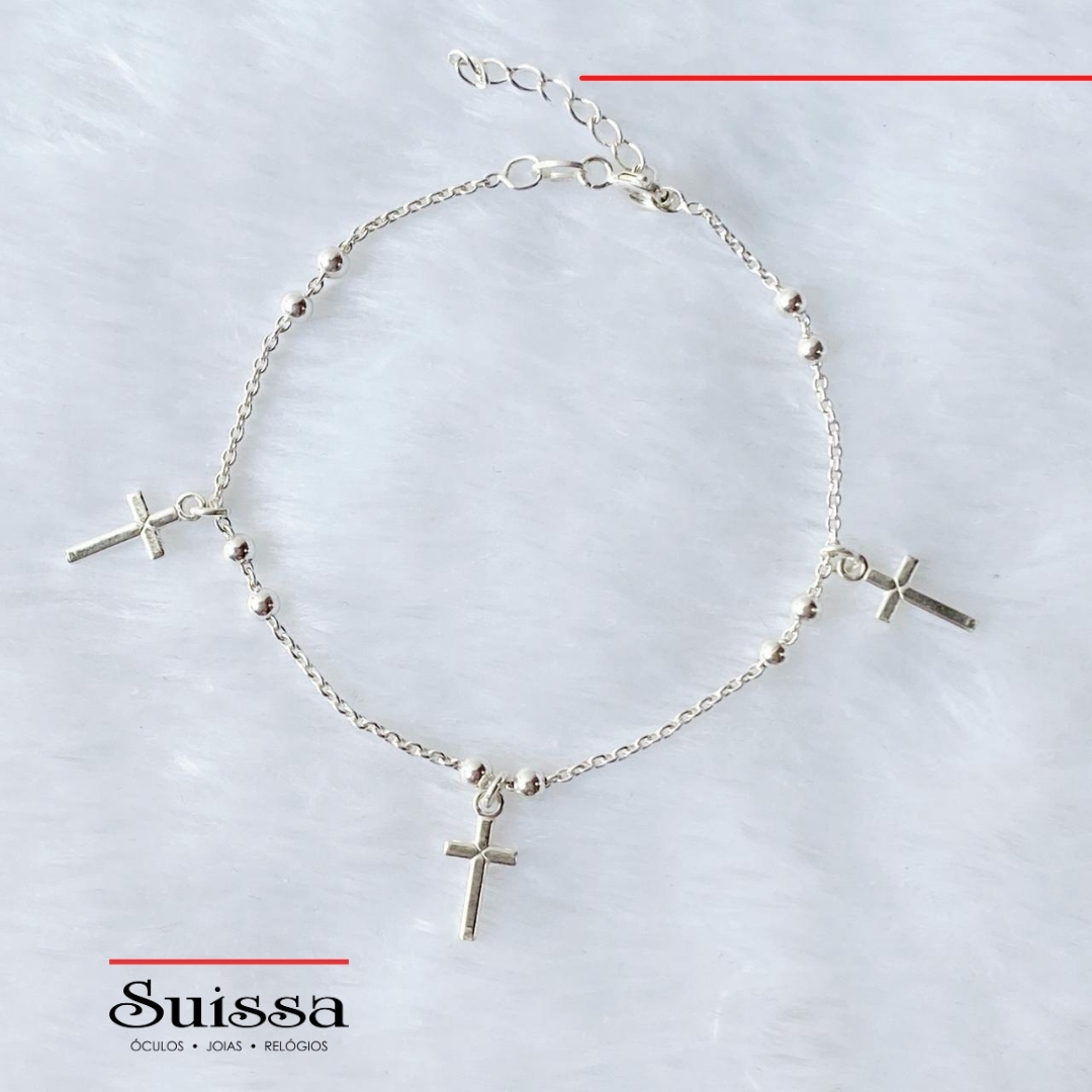 E essa é mais uma exclusividade! Confeccionada em prata 925, a pulseira tem elos ovais, pequenas bolinhas que complementam o design e 3 cruzes lisas.