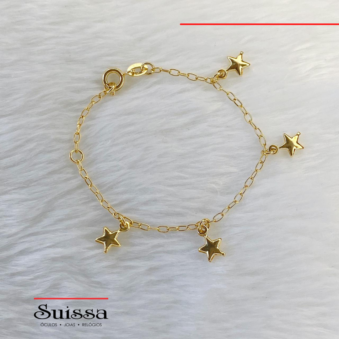 Pulseira Correntinha Elos Ovais Folheada a Ouro Pingente de Estrelas