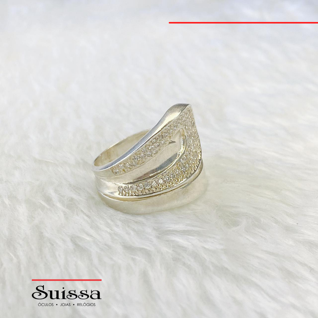 Confeccionado em prata 925, o anel conta com design de onda e é todo cravejado de zircônias brancas.