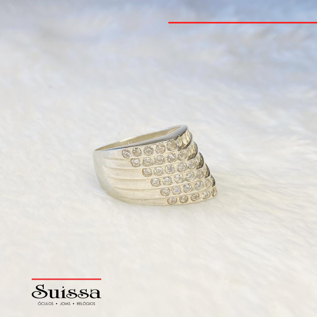 O anel é confeccionado em prata 925, conta com 6 aros cravejados de zircônias brancas e tem design triangular.