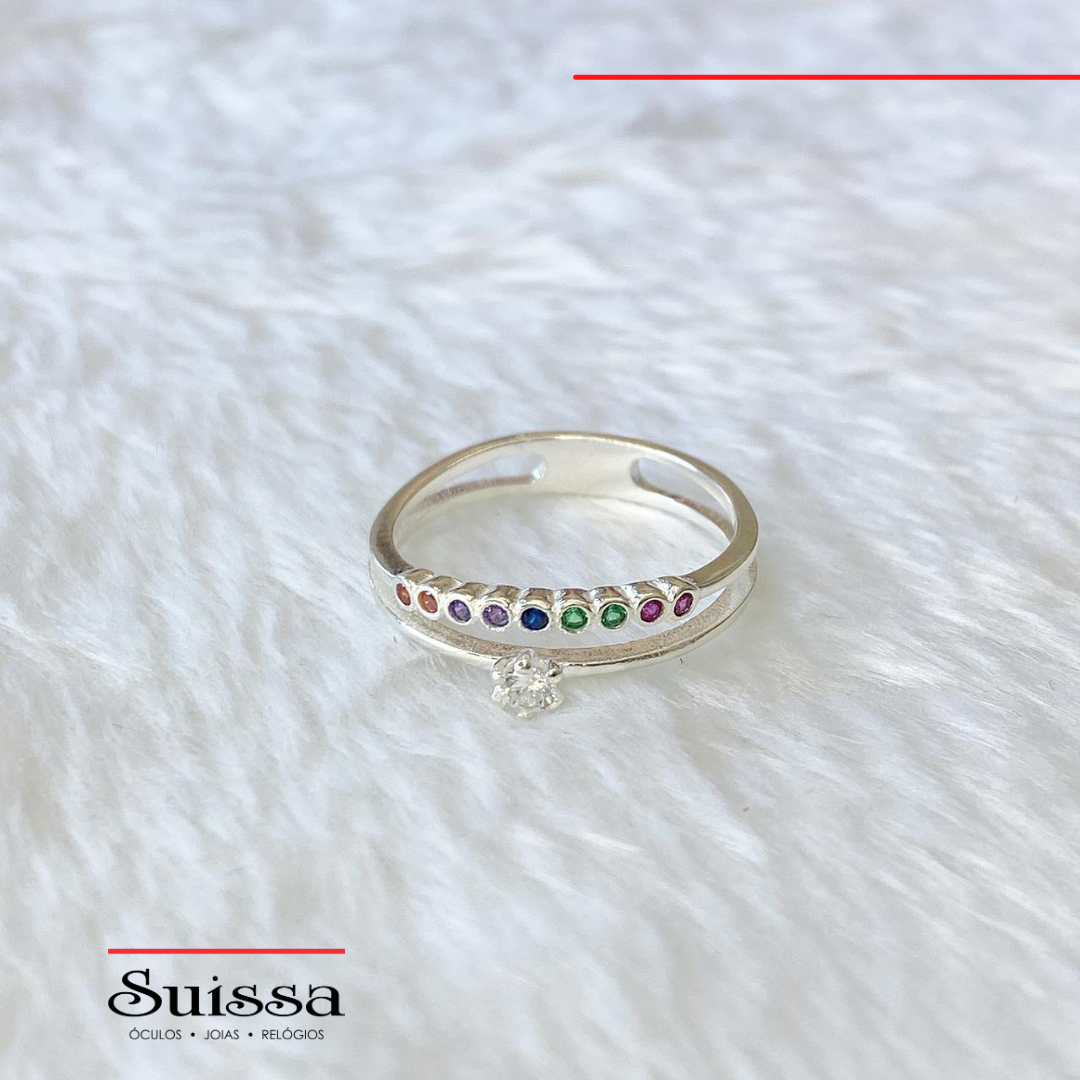 Anel Solitário em Prata 925 Cravejado de Zircônias Coloridas