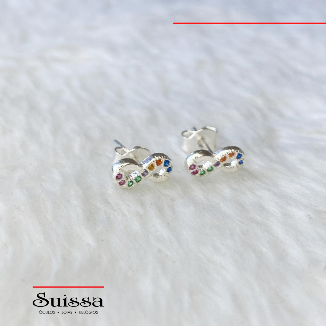 Confeccionado em prata 925, o brinco com um lindo design de infinito todo cravejada de zircônias coloridas.