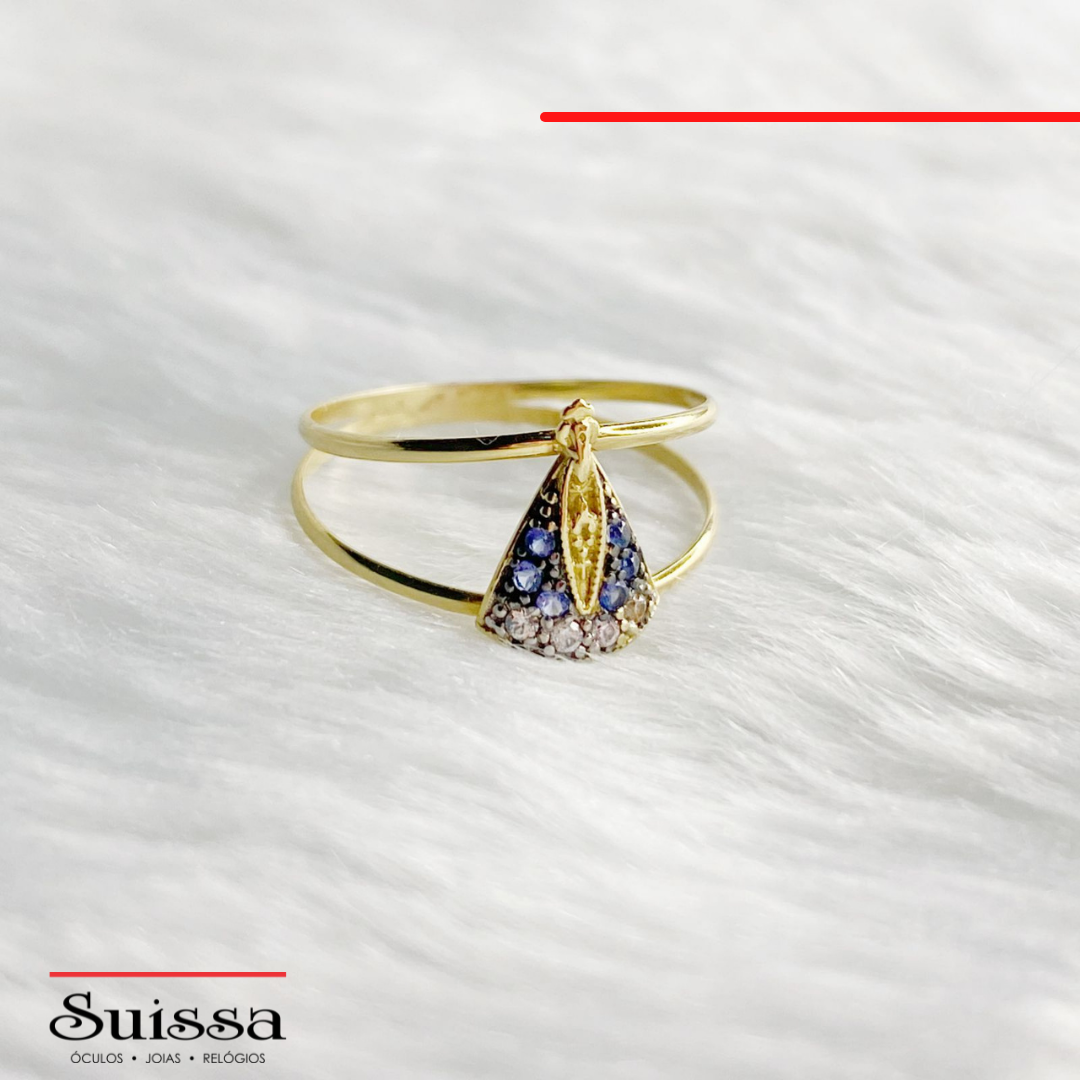 Anel confeccionado em ouro 18K, aro duplo, acabamento polido e a Nossa Senhora Aparecida cravejada de zircônias brancas e azuis ao centro.