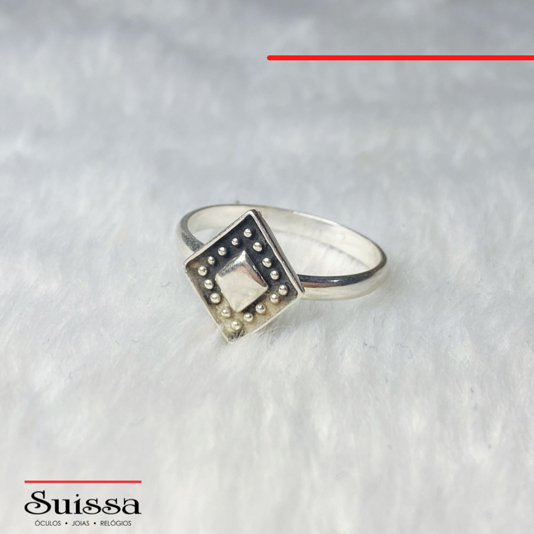 Lindo anel confeccionado em prata, acabamento polido, aro liso com losango todo trabalhado.