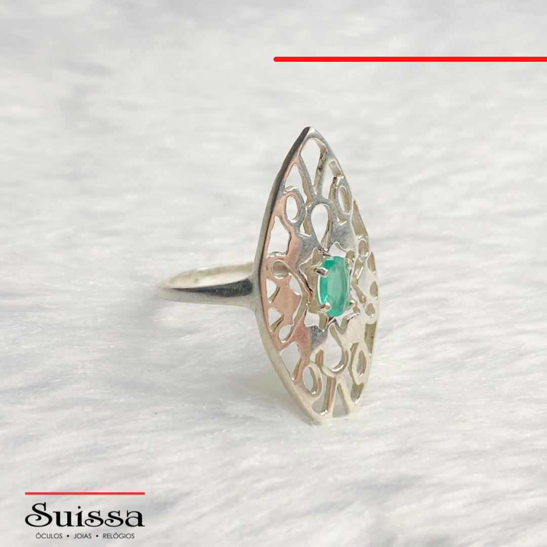 Anel em Prata 925 - Aro Liso Gota Trabalhada e Vazada com Zircônia Verde Água no Centro