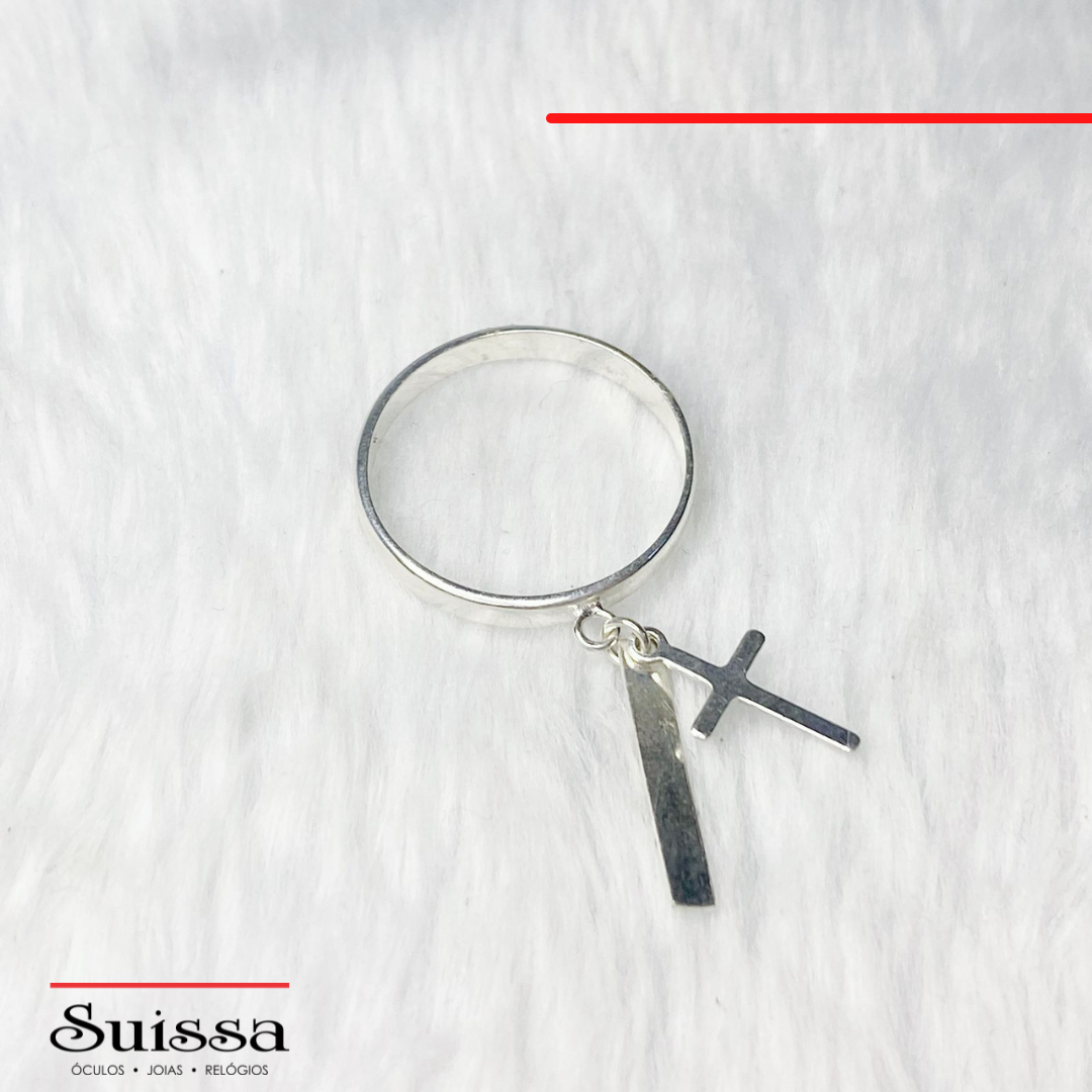 Anel em Prata 925 Aro Liso Pingente de Cruz e Plaquinha
