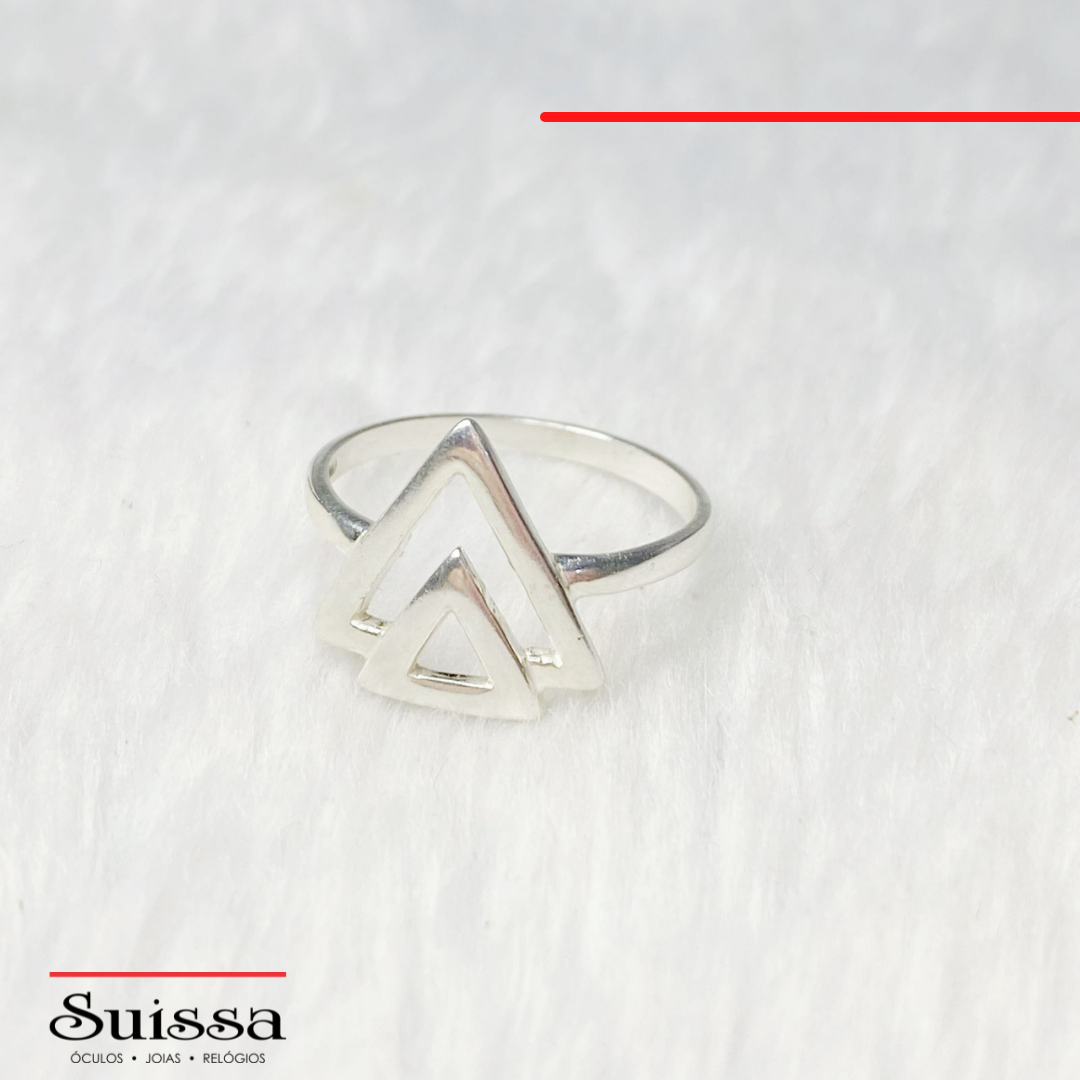 Lindo anel confeccionado em prata, acabamento polido, aro simples e com dois triângulos vazados.