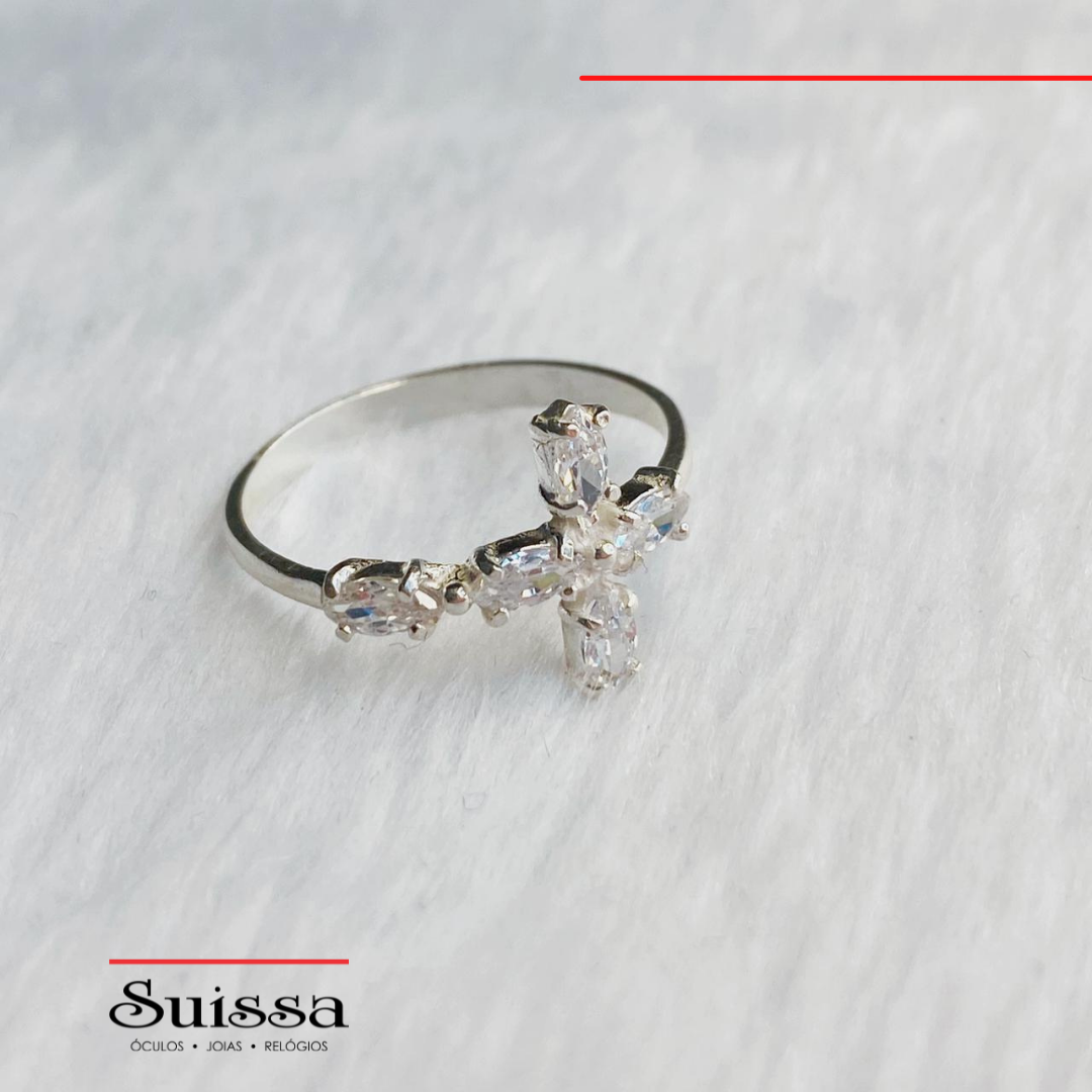 Anel em Prata 925 Cruz com Zircônias Navete