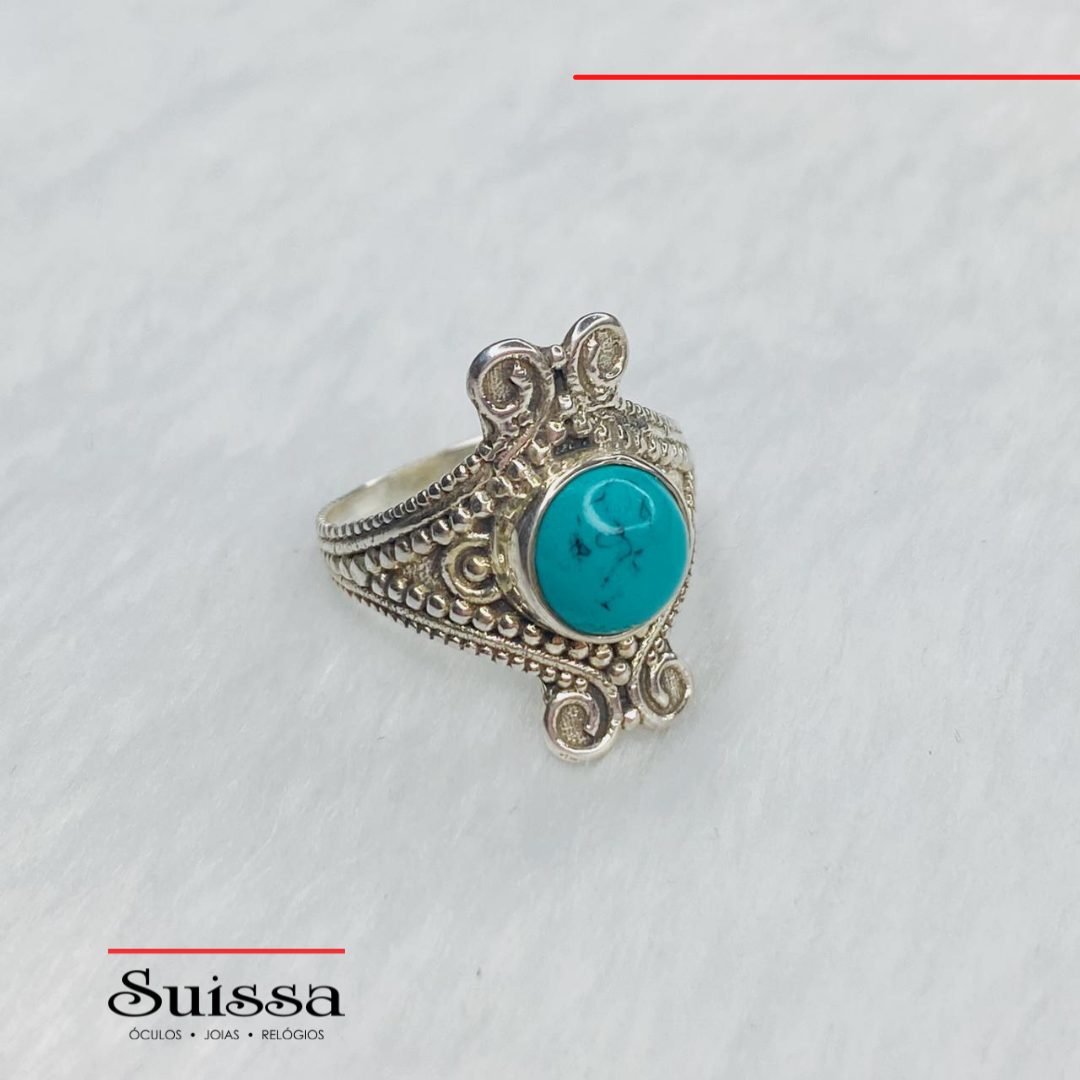 Uma peça arrojada, confeccionada em prata 925 bali, todo trabalhado com aro liso e conta com uma delicada pedra turquesa.