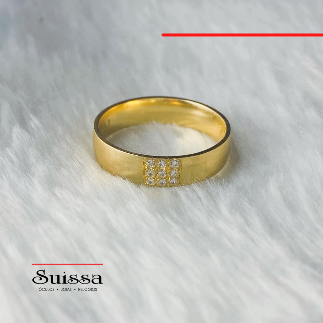 Confeccionada em ouro 18K, a aliança conta com acabamento polido, tem bordas retas e conta com nove brilhantes.