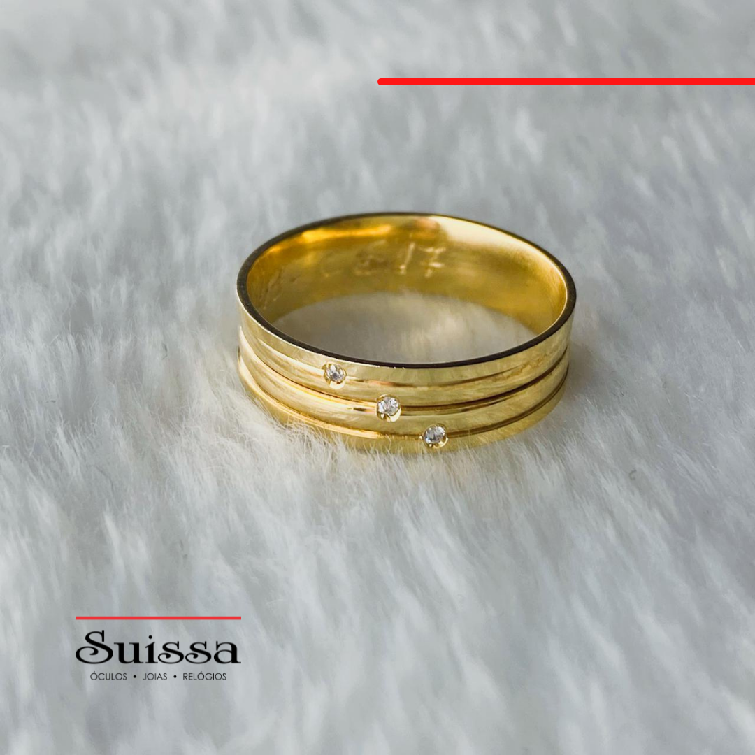 Com design reto, a aliança tem acabamento polido, conta com delicados frisos e três brilhantes.