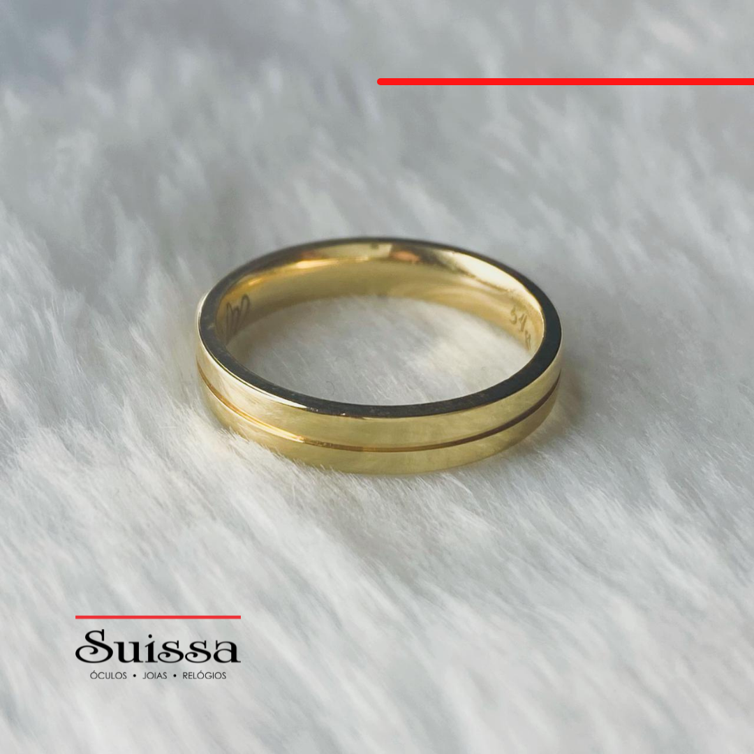 Aliança confeccionada em ouro 18K, com acabamento polido, reta e com friso central em baixo relevo.