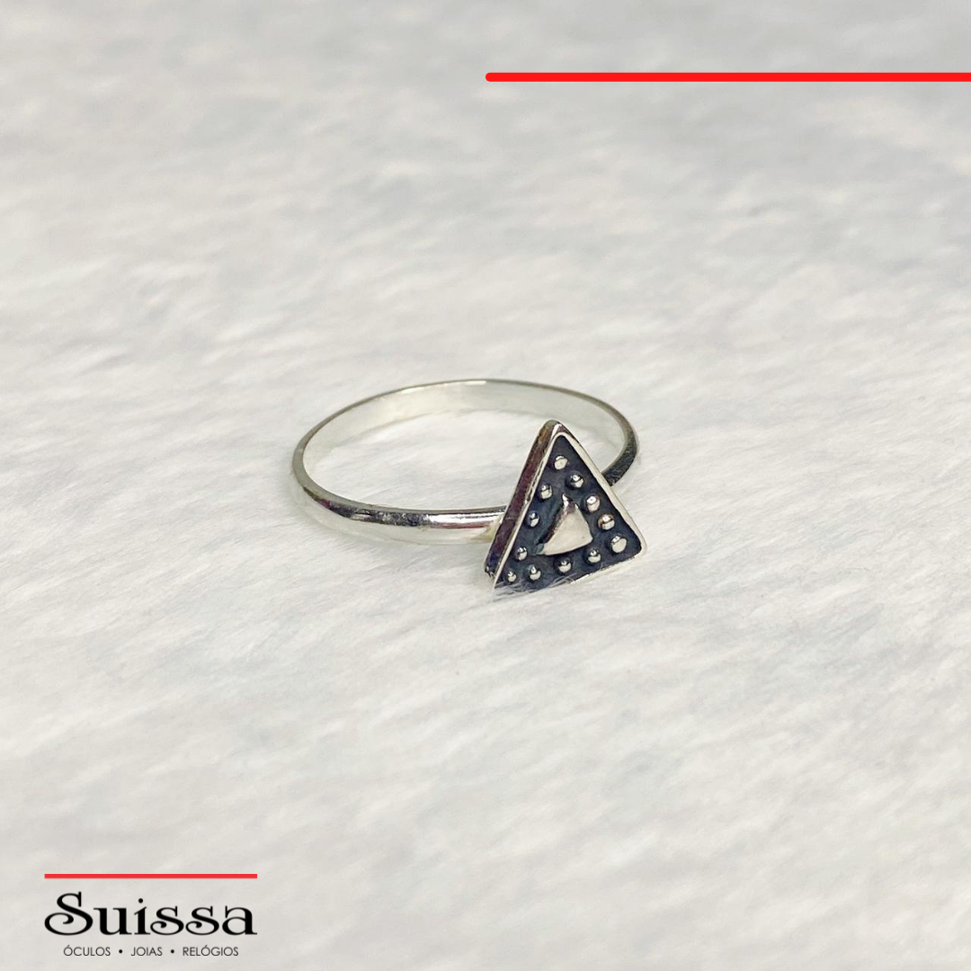 Confeccionado em prata 925, o anel conta com acabamento polido e aro liso. Ele tem um delicado triângulo trabalhado.