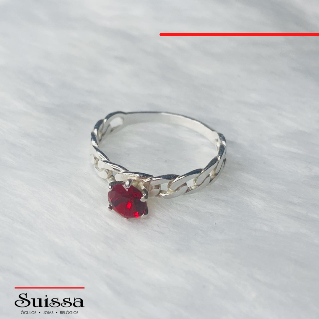 Anel Solitário em Prata 925 - Aro Grumet com Zircônia Vermelha ao Centro
