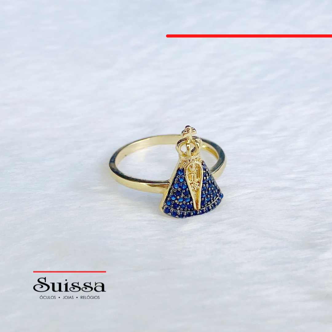 Folheado a ouro, o anel conta com a Nossa Senhora em seu manto todo cravejado de zircônias azuis.