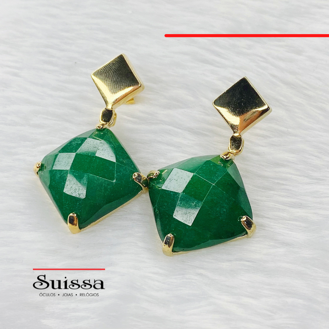 Folheados a ouro, os brincos contam com acabamento polido e uma linda pedra quadrada verde.