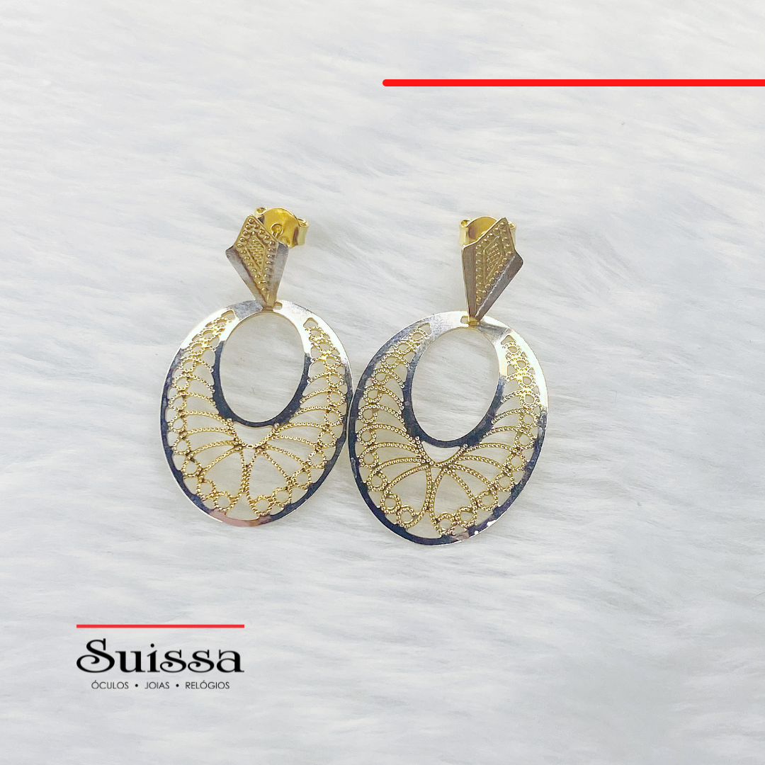 Folheados a ouro, os brincos possuem design oval e é todo trabalhado com desenhos recortados a laser.