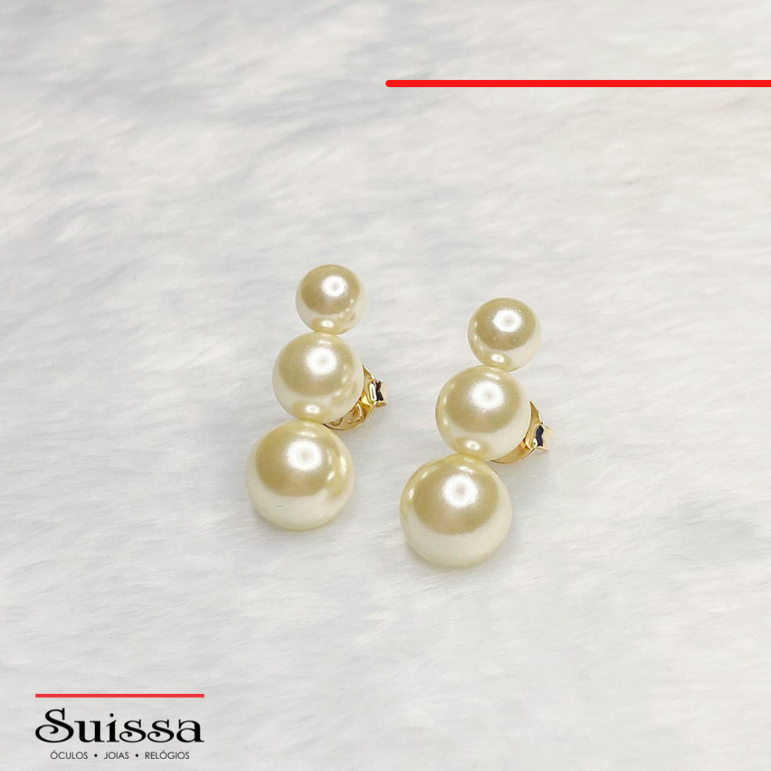 Os brincos são folheados a ouro, os brincos contam com 3 pérolas sintéticas e têm acabamento polido.
