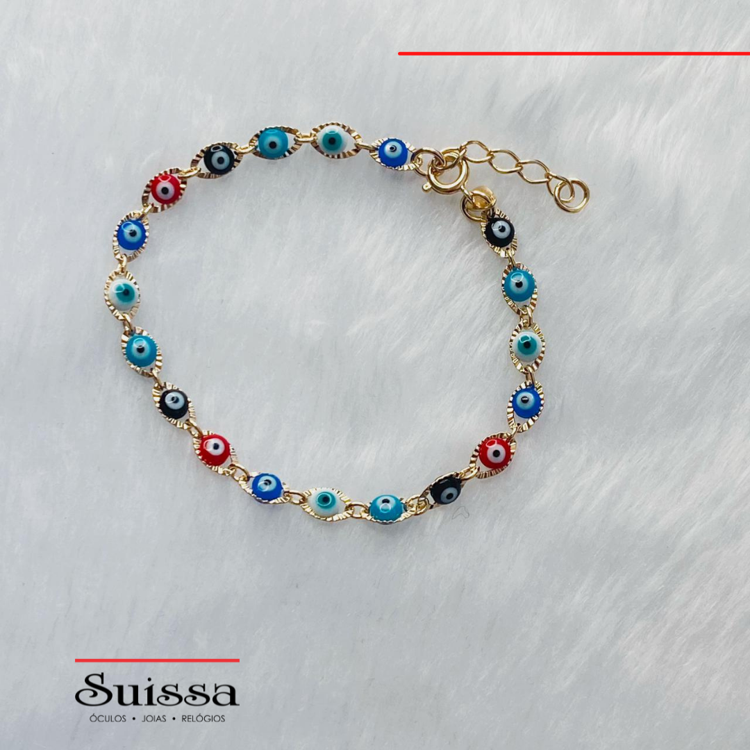 A pulseira é folheada a ouro, é toda trabalhada e conta com lindos olhos gregos.