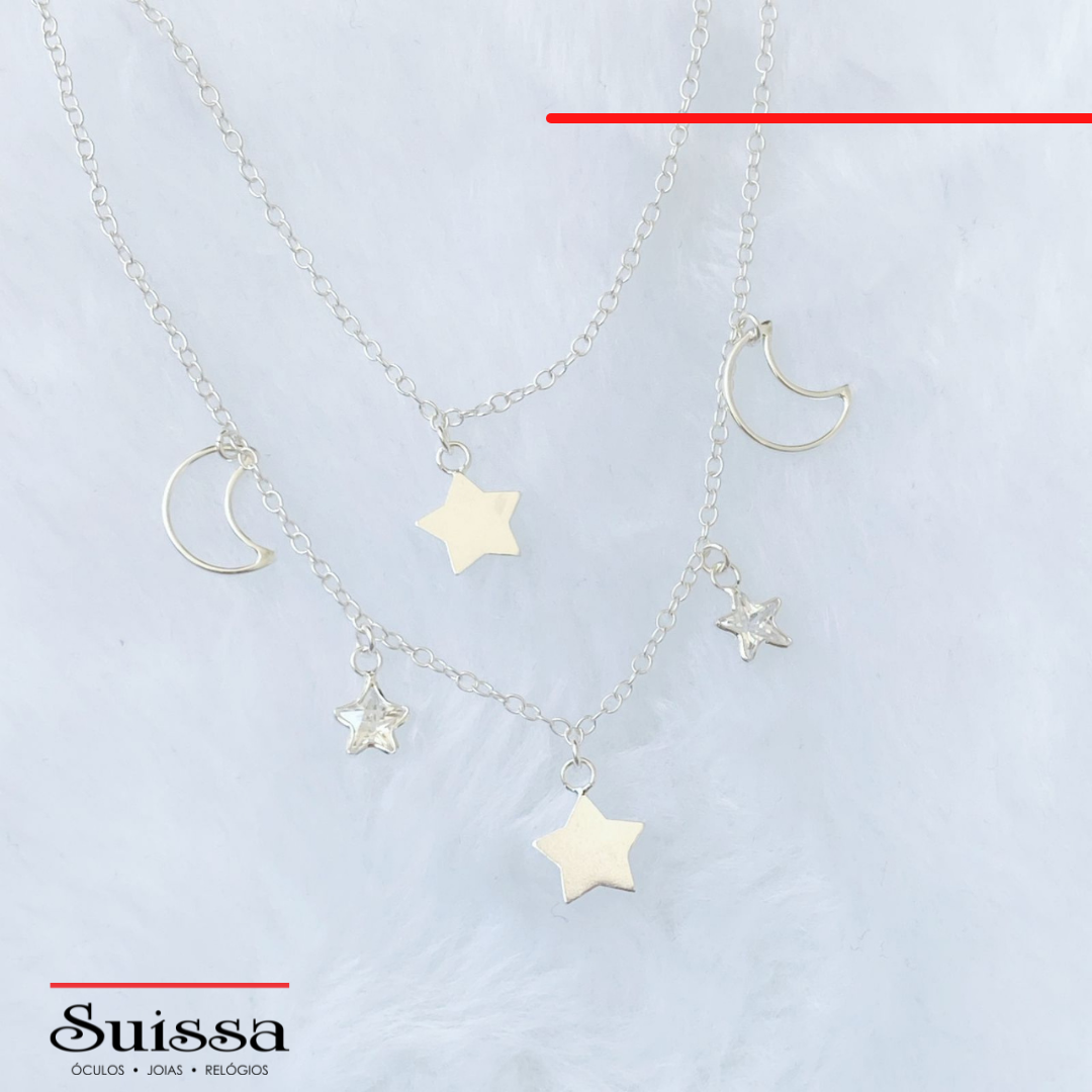 Colar em Prata 925 Elos Ovais 2x1 com Lua e Estrelas
