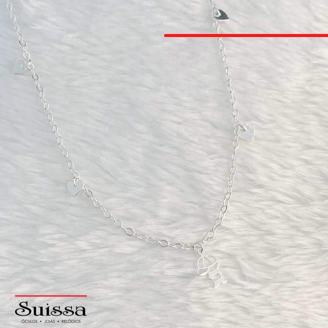 Colar em Prata 925 Elos Ovais Pingente de Corações e Menino