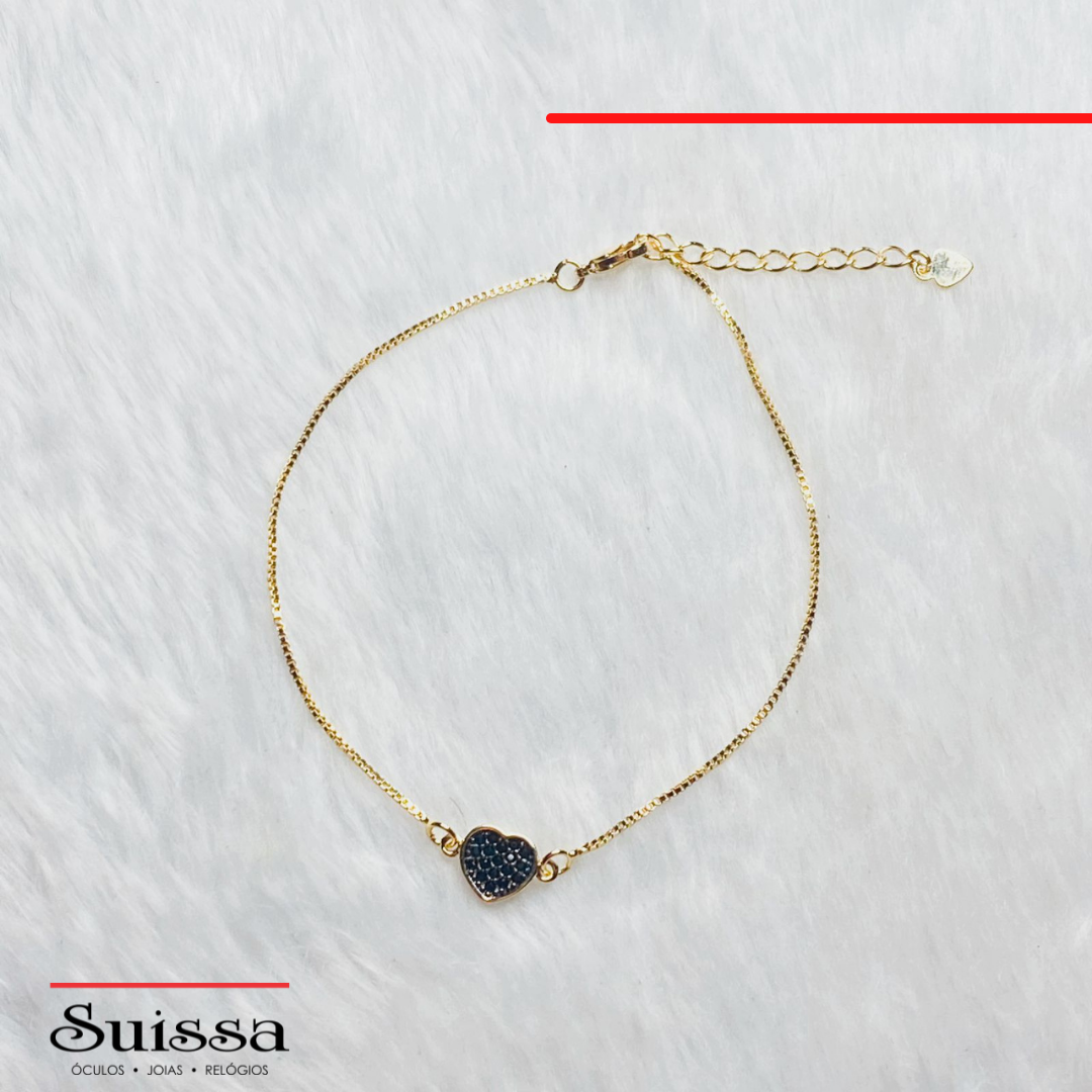 Pulseira folheada a ouro com malha veneziana e lindo pingente de coração cravejado de zircônias pretas.