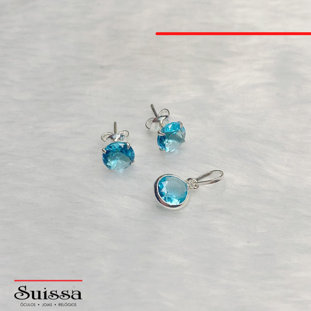 Conjunto em Prata 925 Pingente e Brincos com Zircônias Azuis
