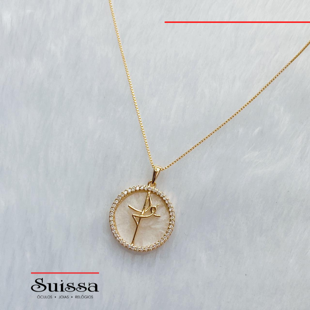 Conta com um lindo pingente redondo personalizado com a palavra fé com uma madrepérola e todo cravejado de zircônias brancas.