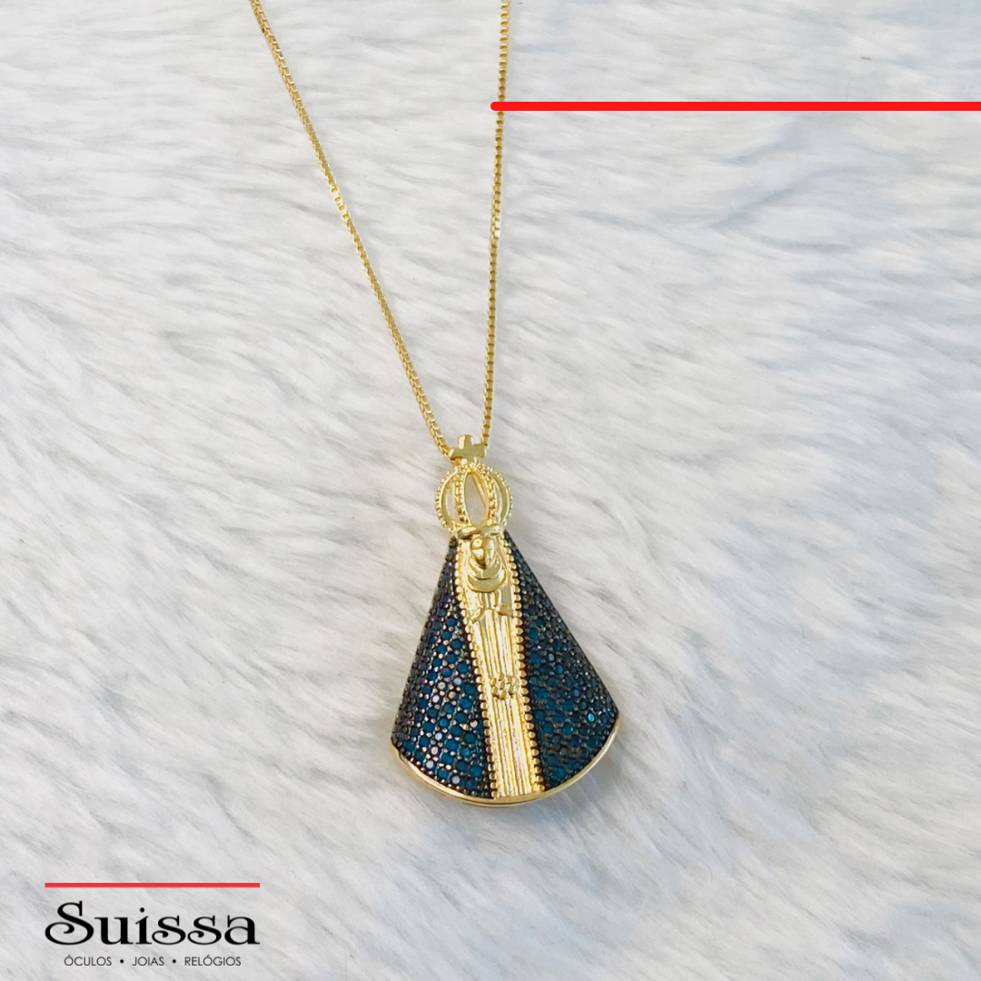 O colar conta com malha veneziana, lindo pingente de Nossa Senhora Aparecida cravejado de zircônias azuis.
