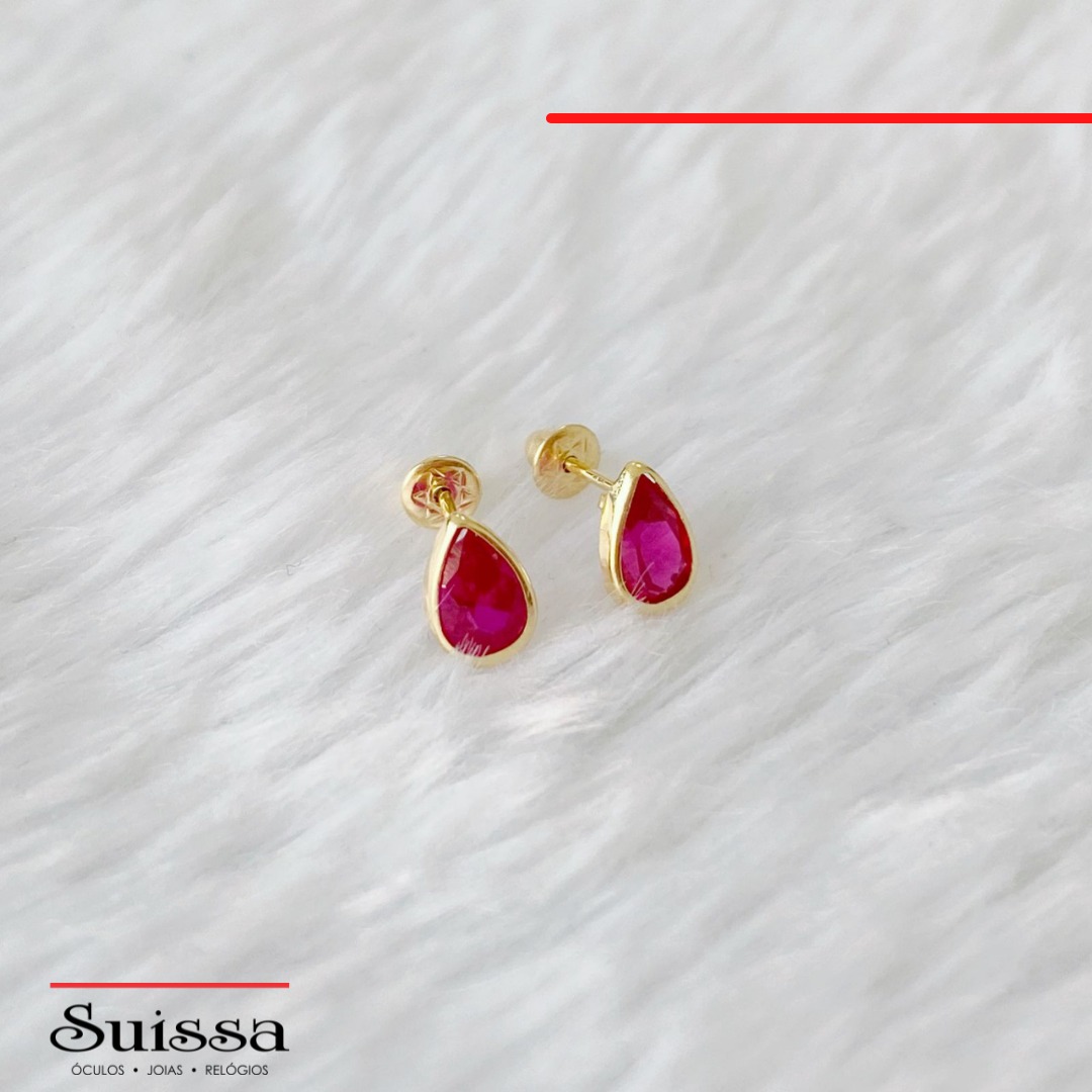 Par de Brincos em em Ouro 18K Zircônia Vermelha Gota