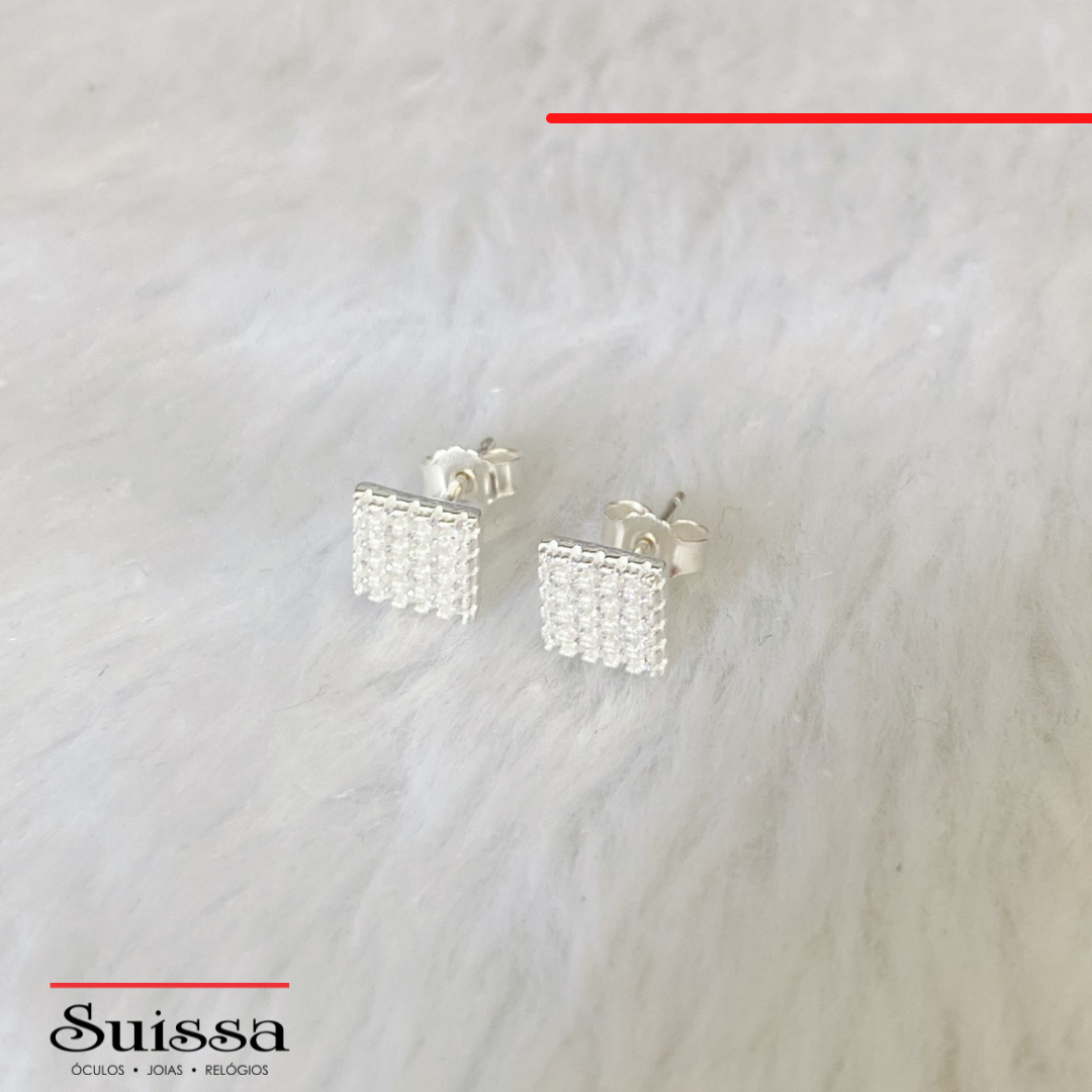 Par de Brincos em Prata 925 Quadrado com Zircônias Brancas