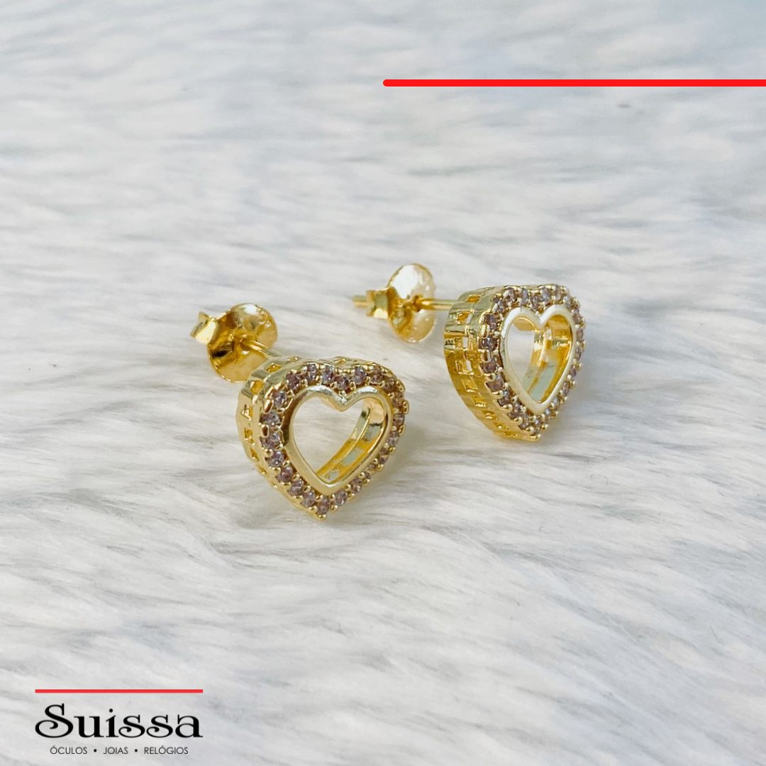 Os brincos são folheados a ouro, contam com design de coração e são cravejados de lindas zircônias brancas.