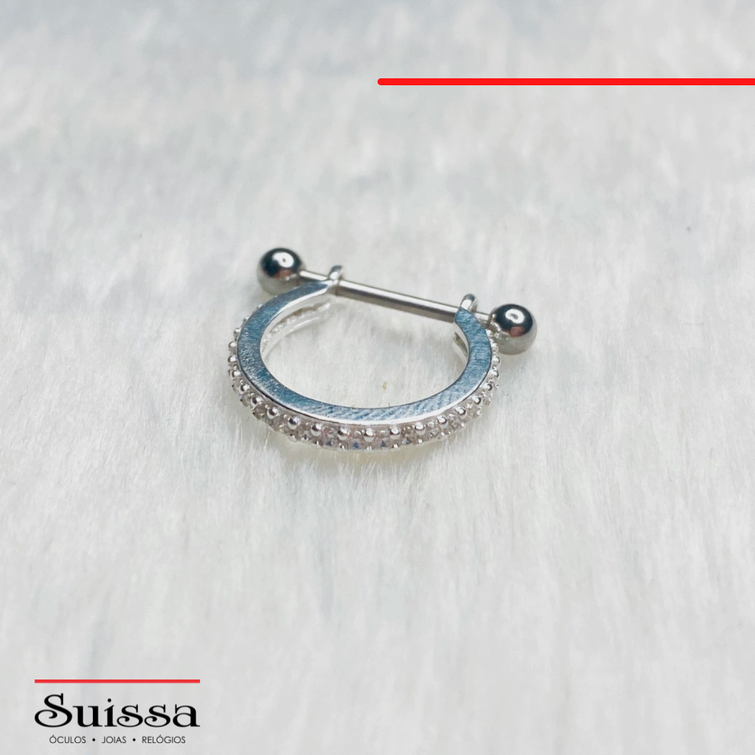 Lindo piercing em prata 925 com acabamento polido e design de argola toda cravejada de zircônias brancas.