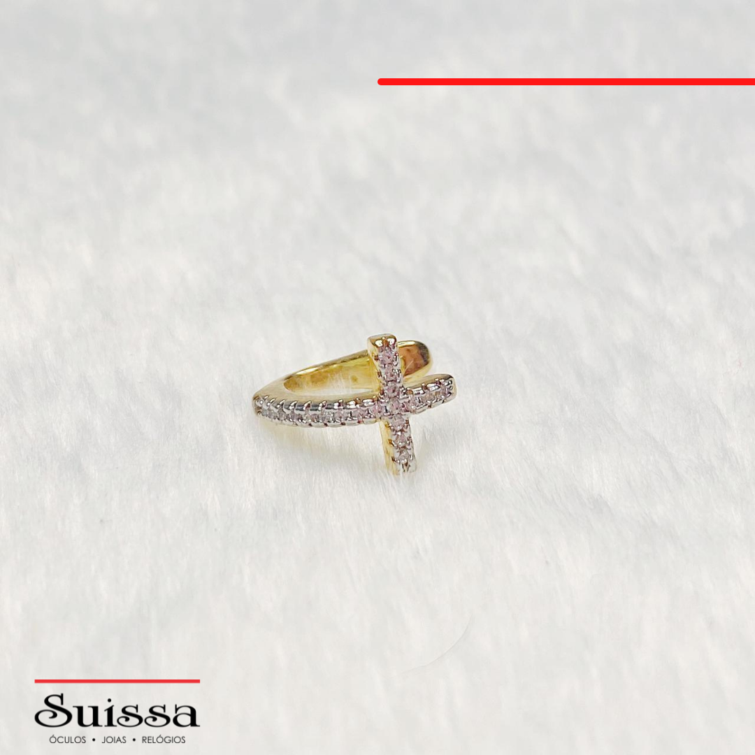 Piercing Fake folheado a ouro com cruz toda cravejada de zircônias.