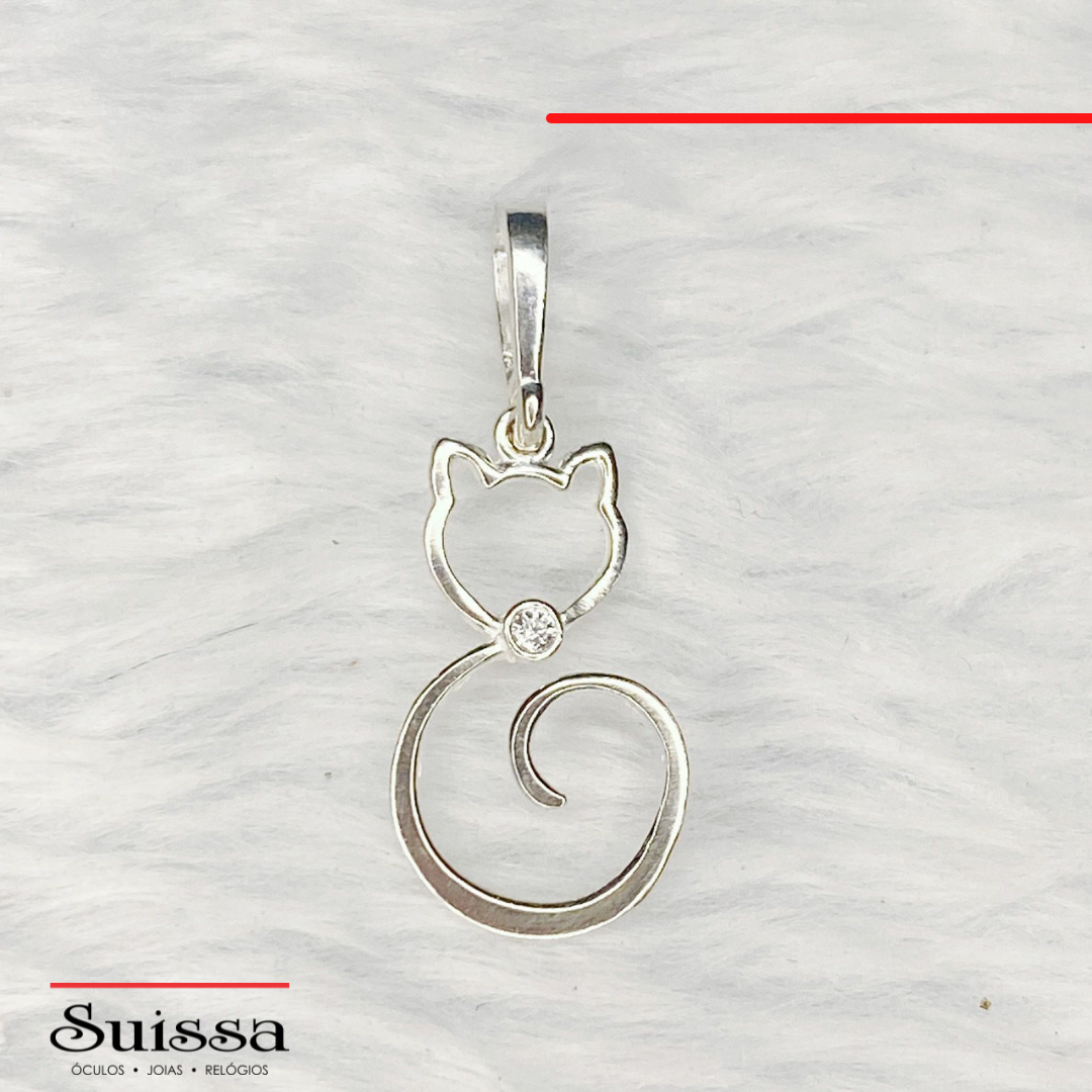 Lindo pingente confeccionado em prata 925 com design de gatinho e uma zircônia delicada.