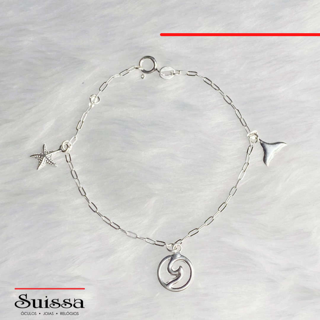 A pulseira conta com um pingente de cauda de sereia, um de estrela do mar e outro de onda.