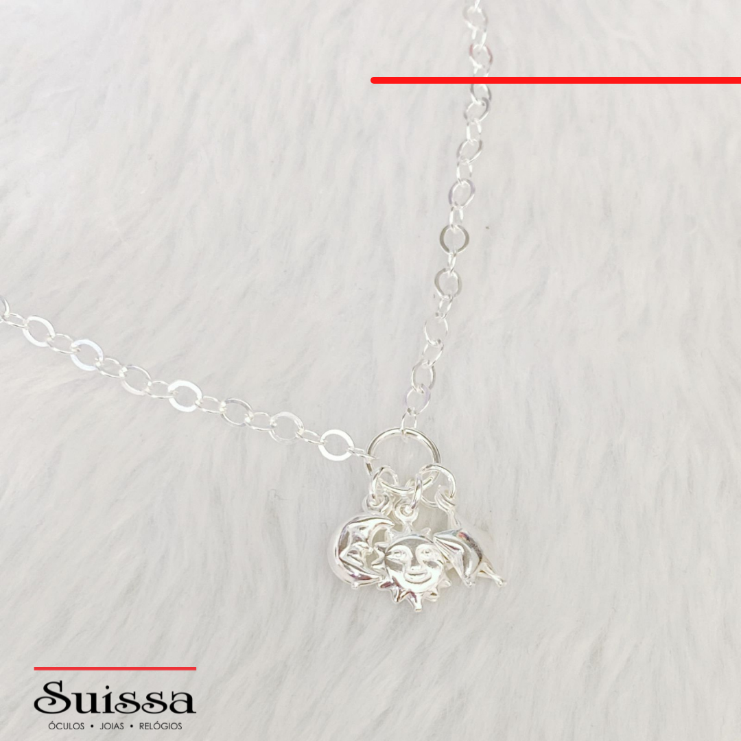 Pulseira em Prata 925 Elos Redondos e Pingentes de Meia Lua, Sol e Estrela