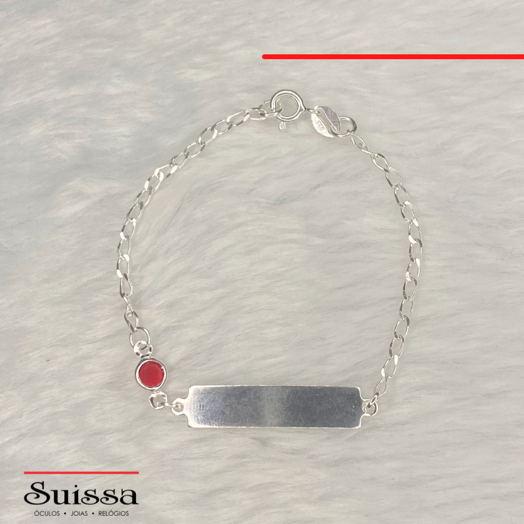 Pulseira infantil confeccionada em prata 925 com chapinha para gravação de nome. Conta com uma zircônia vermelha.