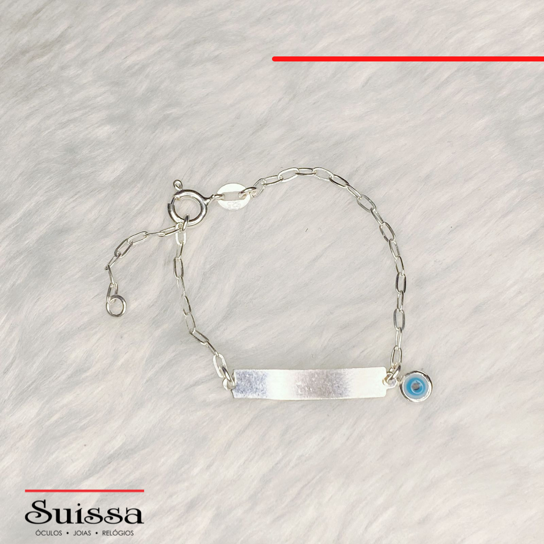 Pulseira infantil confeccionada em prata 925 com chapinha para gravação de nome. Além disso, conta com um lindo olho grego.