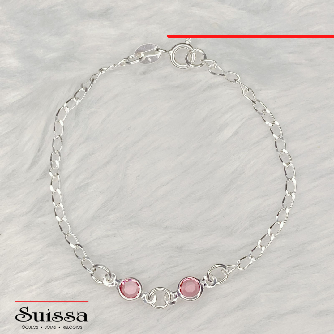 Pulseira Infantil em Prata 925 Elos Iguais Zircônias Rosas