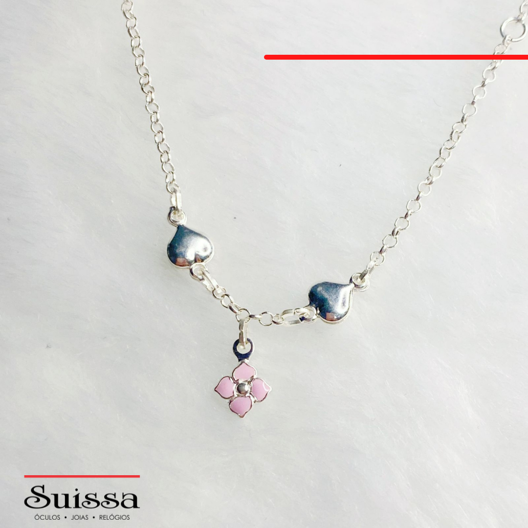 Pulseira Infantil em Prata 925 Elos Portugueses 14cm Corações e Flor
