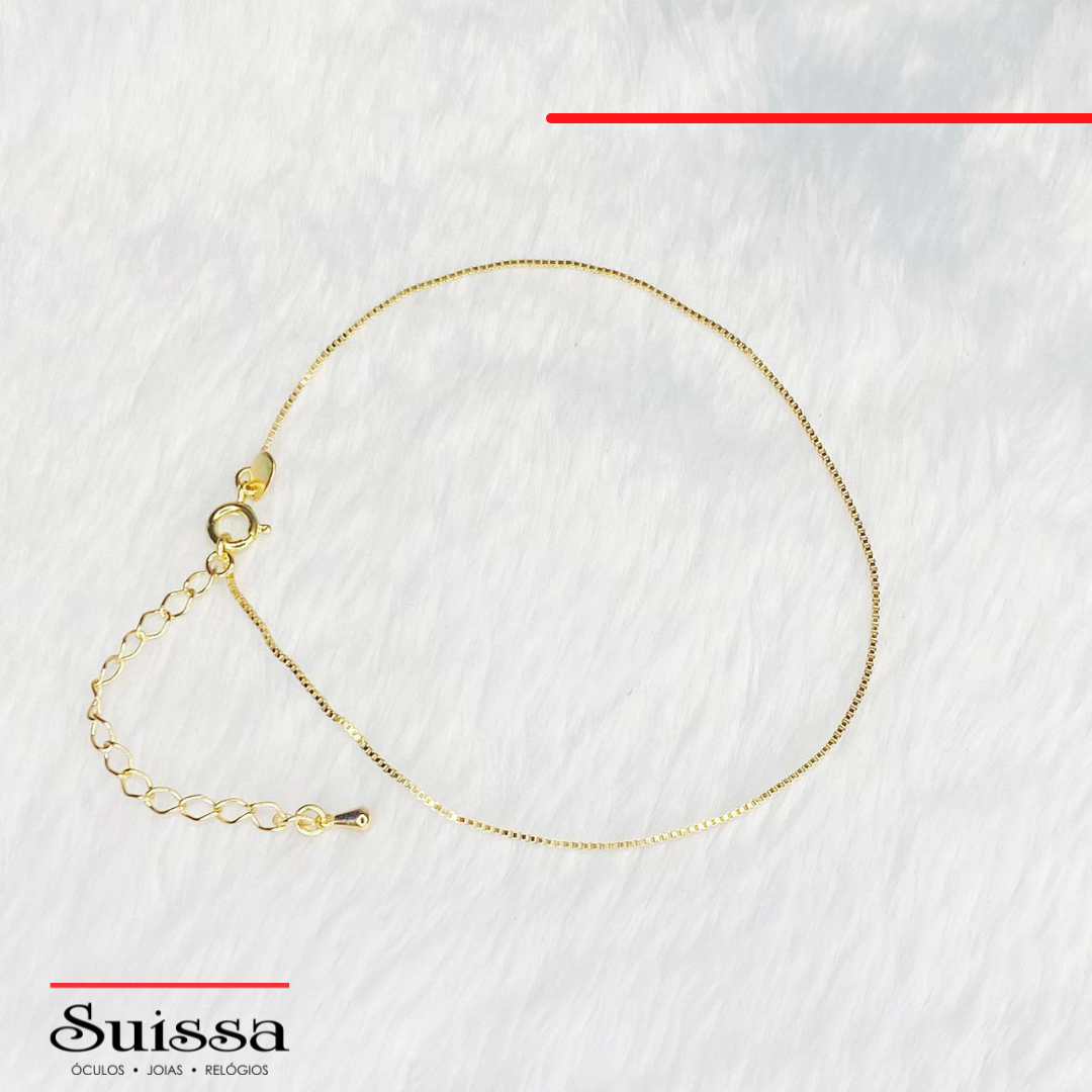 Delicada e charmosa tornozeleira folheada a ouro com malha veneziana. Possui acabamento fino e polido.
