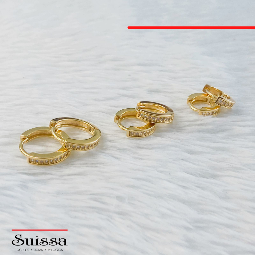 Trio de Brincos Folhados a Ouro Argola Zircônias Brancas