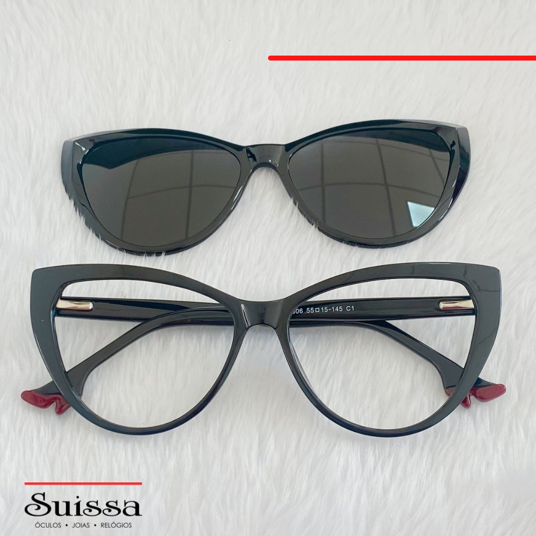 E para ficar ainda melhor, são no modelo clip on, 2 em 1. Óculos de sol e de grau. Para modificar, basta colocar o de sol por cima do de grau.
