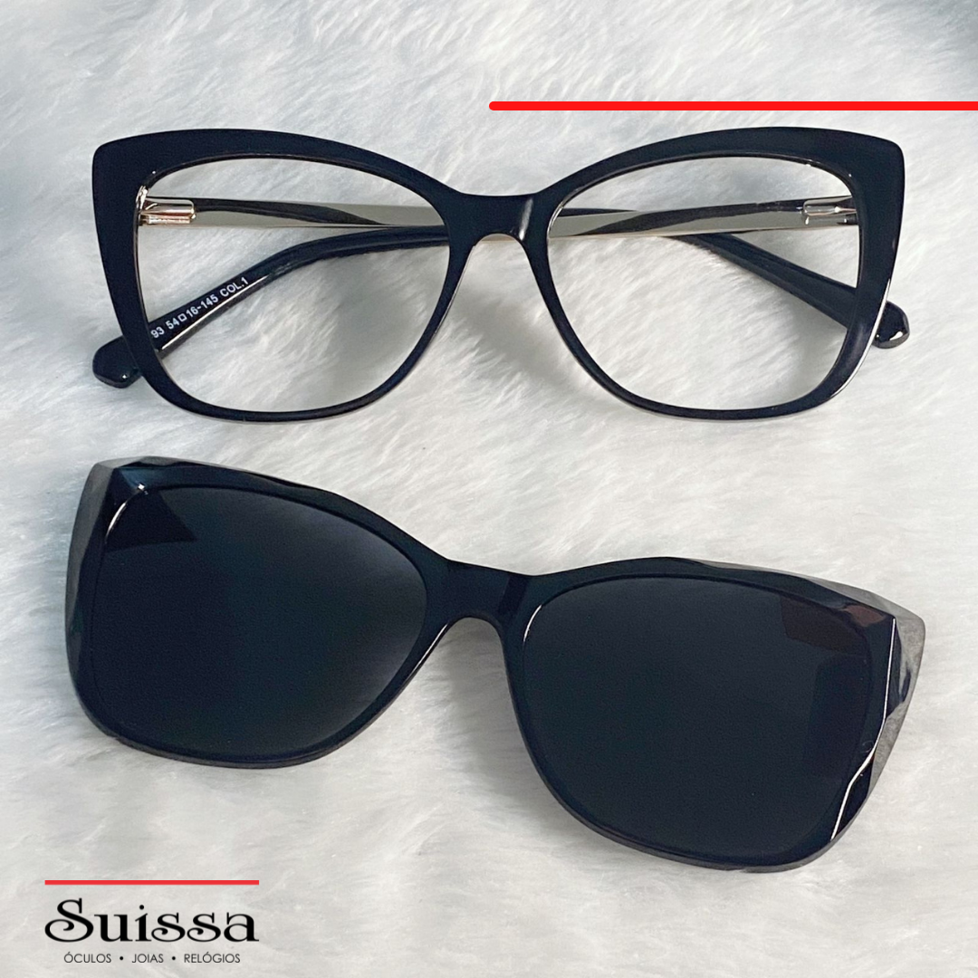 E para ficar ainda melhor, são no modelo clip on, 2 em 1. Óculos de sol e de grau. Para modificar, basta colocar o de sol por cima do de grau.