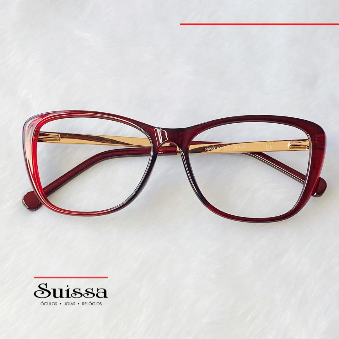E essa armação é mais uma de nossas criações que encantam. Confeccionada em acetato, a armação tem design retangular, conta com detalhes dourados.