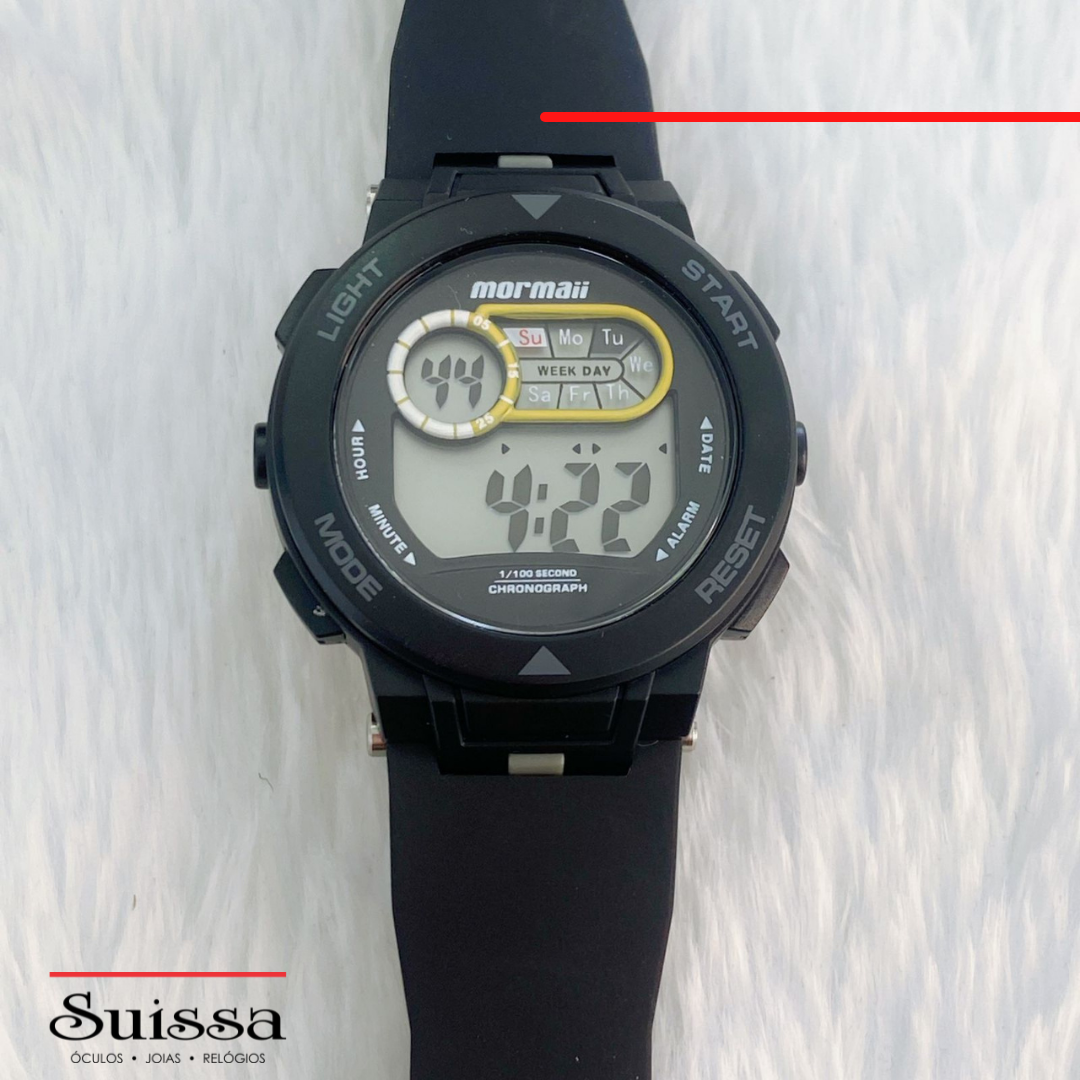 Relógio modelo NXT, digital, possui alarme, cronometro, calendário e visor colorido LCD.